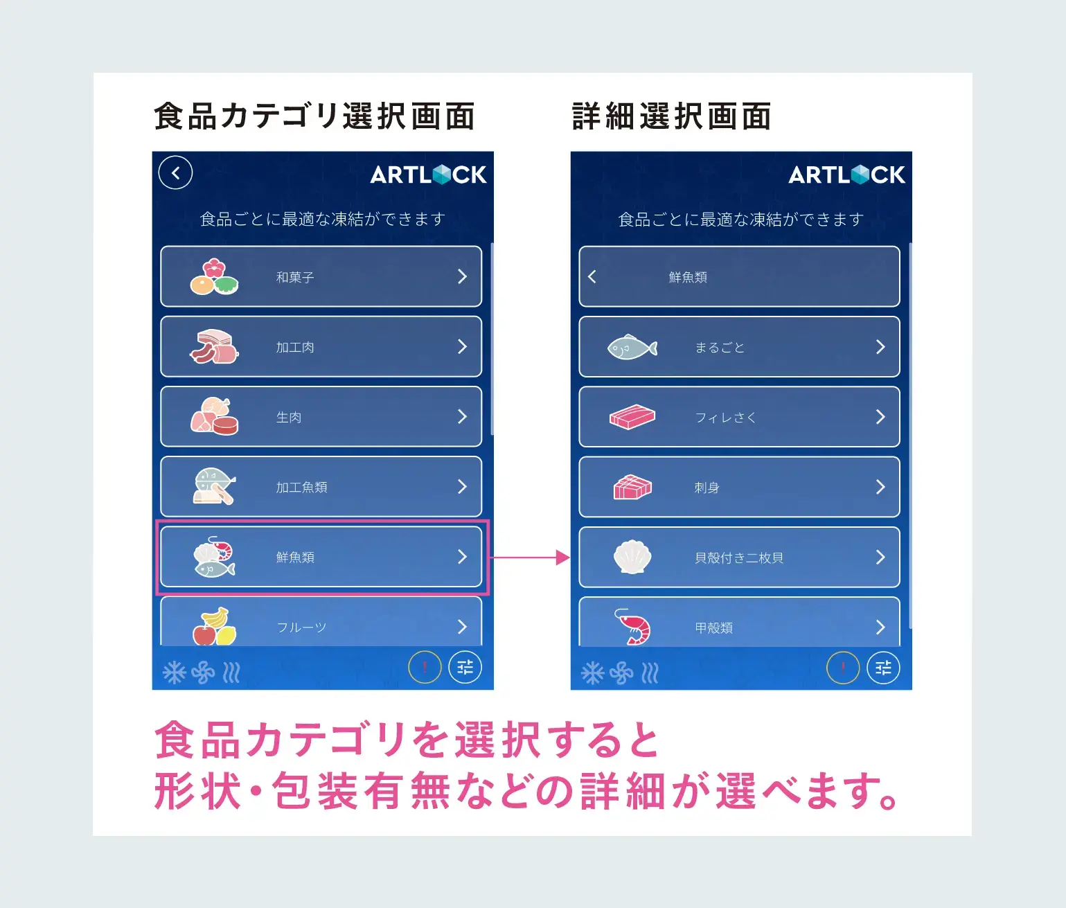 デイブレイクが10年以上蓄積してきた研究ノウハウを基に、「食品別モード」を搭載。対象の食品を選択するだけで、食品ごとに最適な冷凍条件で運転、高品質な仕上がりを安定して実現します。食品の形状・包装容器の有無などの詳細も選択でき、お気に入り登録で効率的な操作も可能です。