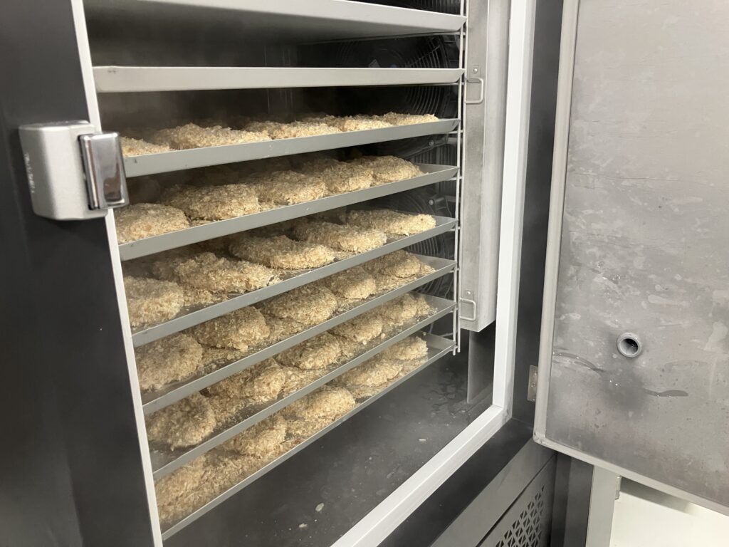 導入後、まず取り組んだのがステーキ用牛肉の冷凍保管・流通です。店舗ごとに日々変動する注文量に対し、ロスを出さず安定供給できる体制を整えました。さらに、カツ丼業態で使用する「揚げる前のとんかつ」の冷凍にも着手しています。アートロックフリーザーは強風を当てて凍結する方式ではないため、パン粉が飛ばず、つけたてのふんわりした状態を維持できる点が特長です。CKでパン粉付けまで行い、冷凍した状態で各店舗へ配送するオペレーションの検証を進めています。